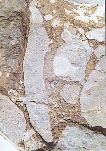L'élément allongé ci-dessus est la coupe verticale d'une colonie de Stromatopodes, dont on devine les strates empilées. Ces Éponges n'existent plus dans les mers actuelles.