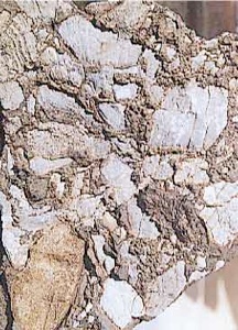 Aspect général de la surface d'un bloc de 12 cm provenant d'un éboulis. En bas, un galet, typique du conglomérat de Russ. Les morceaux anguleux gris sont les fragments d'un récif, noyés dans une gangue de nature volcanique (lave, de teinte brune).