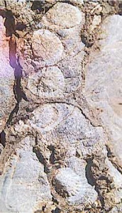 L'autre face du bloc montre les empreintes circulaires d'autres animaux constructeurs de récifs, ou solitaires, comme les lis de mer (Échinodermes Crinoïdes).