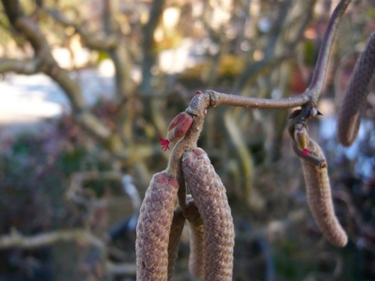 - au parc des Canebiers, voyez les pistils rouges des fleurs femelles du noisetier (Corylus avellana, Bétulacées) (photo n° 1, prise ailleurs), futures noisettes, sur l'un des deux noisetiers de ce parc, celui qui est vers la Cagne (les noisetiers sont les deux bouquets de buissons qui poussent au centre de la pelouse) ; les chatons (mâles) sont déjà fanés ;