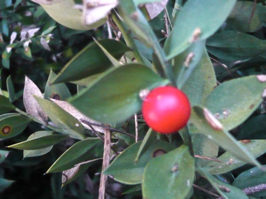 On peut voir aussi les fruits des petits-houx (Ruscus aculeatus, Asparagacées), portés comme les fleurs au centre des cladodes (photo n° 5).