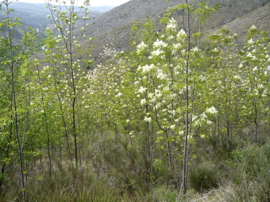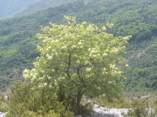 C’est un petit arbre, très résistant à la sécheresse, bien qu’il affectionne les sites un peu plus frais. Il fleurit tard au printemps. Sur les bords du Loup, à Cagnes-sur-Mer, après le 20 avril. Même scénario dans le bois de frênes à fleurs, typique du versant ouest qui permet de monter au Baou des Blancs par le sentier balisé supérieur, à partir de la route D2. La floraison blanche de ces frênes dans la vallée du Var est spectaculaire durant une quinzaine de jours, mais se confond bientôt, pour les personnes non averties, avec celle du robinier (Robinia pseudo-acacia), dont les fleurs blanches forment des grappes pendantes. Le robinier est une espèce invasive, originaire d’Amérique du Nord. En Ligurie, les frênes à fleurs sont très abondants sur les adrets des montagnes. Vers le 15 mai, il en reste peu. Sur l’adret de la montagne de la Madone d’Utelle, un frêne était encore fleuri le 26 mai 2016 (photo ci-dessous).